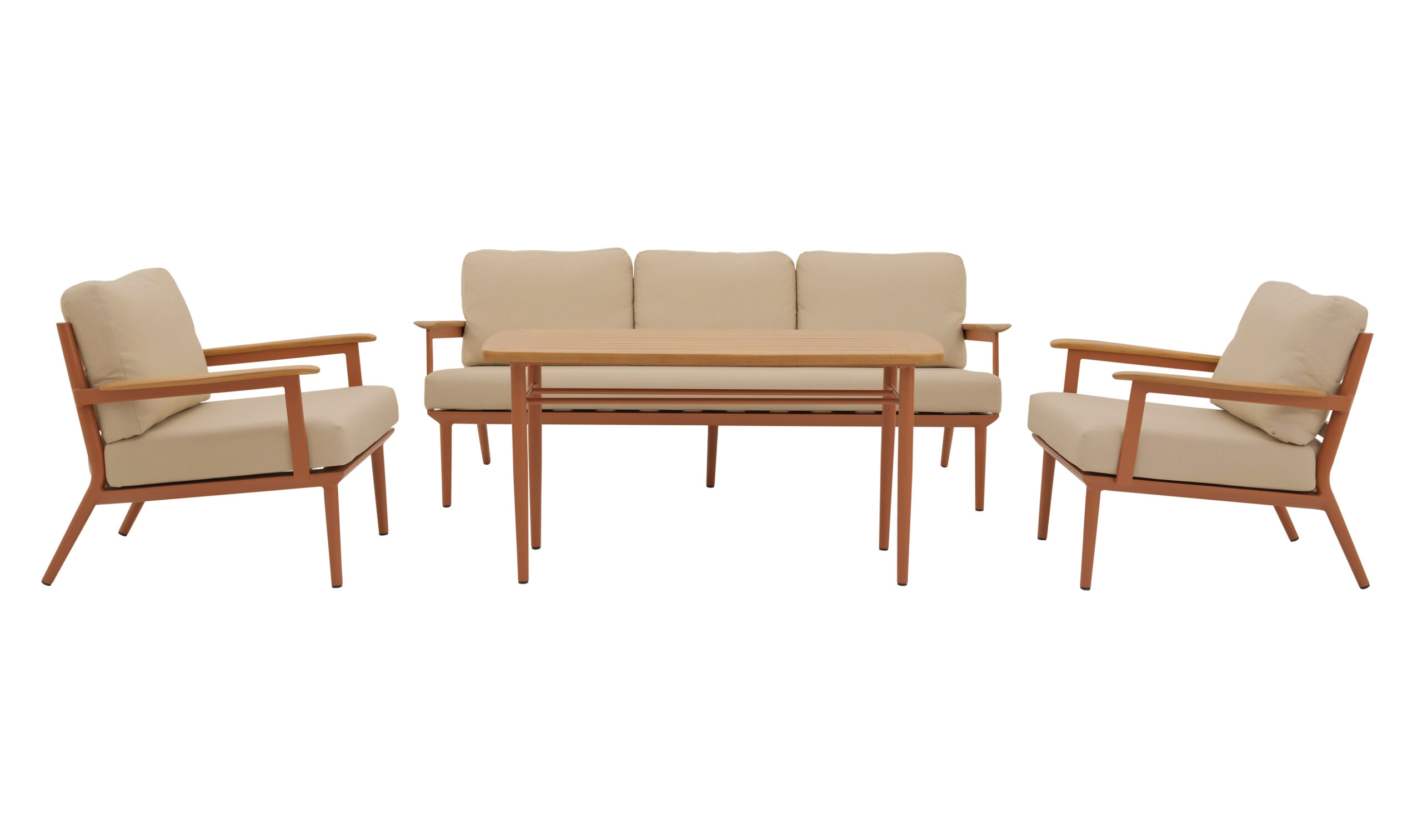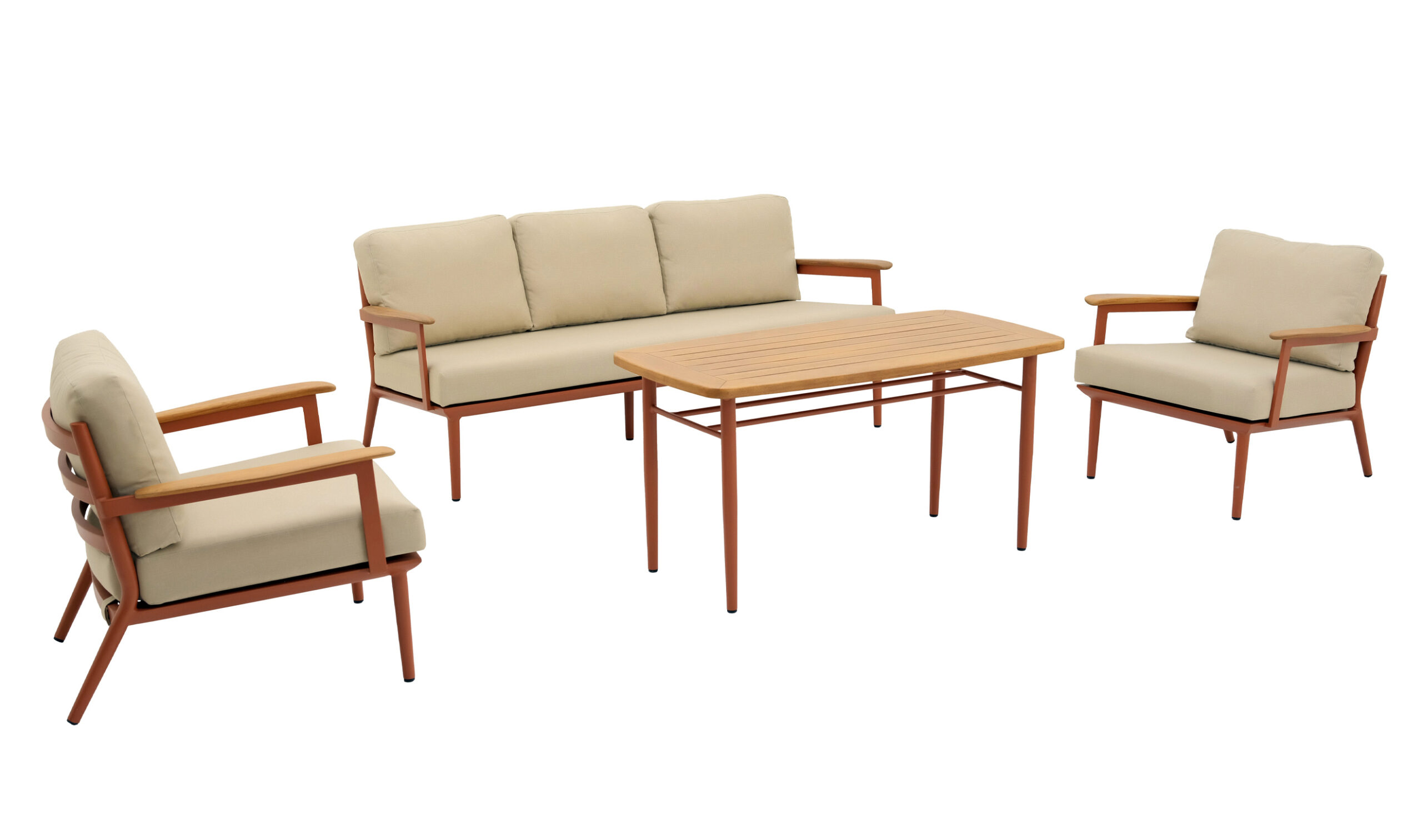 - PRODUCT DETAILS: Aluminum frame with iroko wood work on armrest and upholstered seat and back cushion.