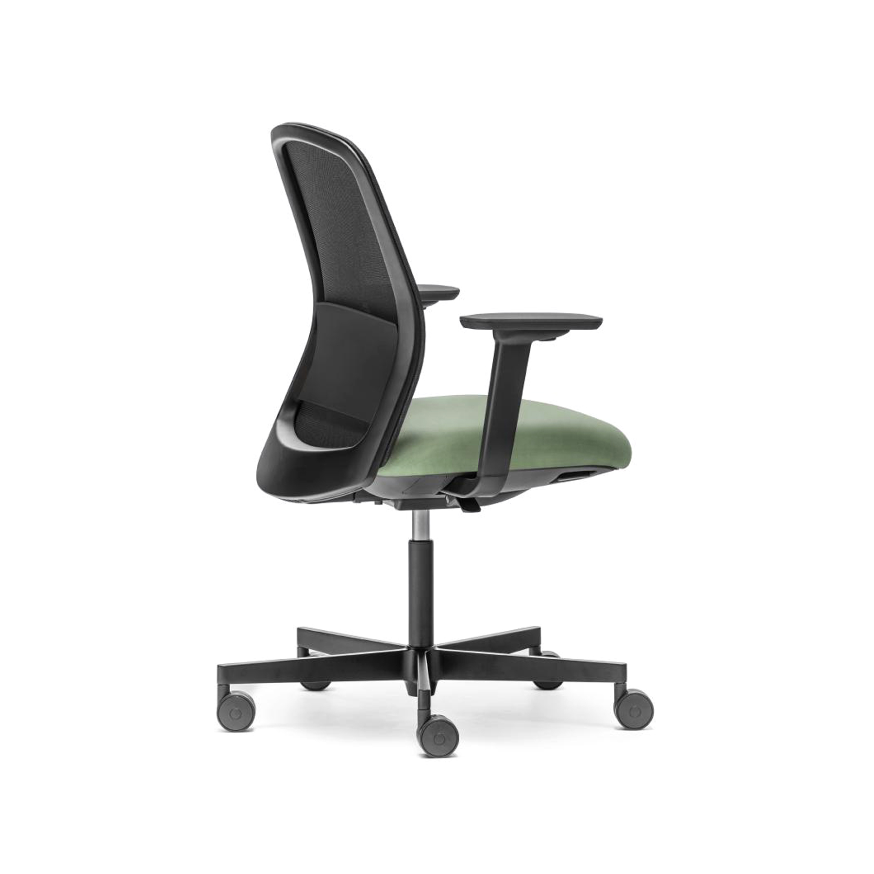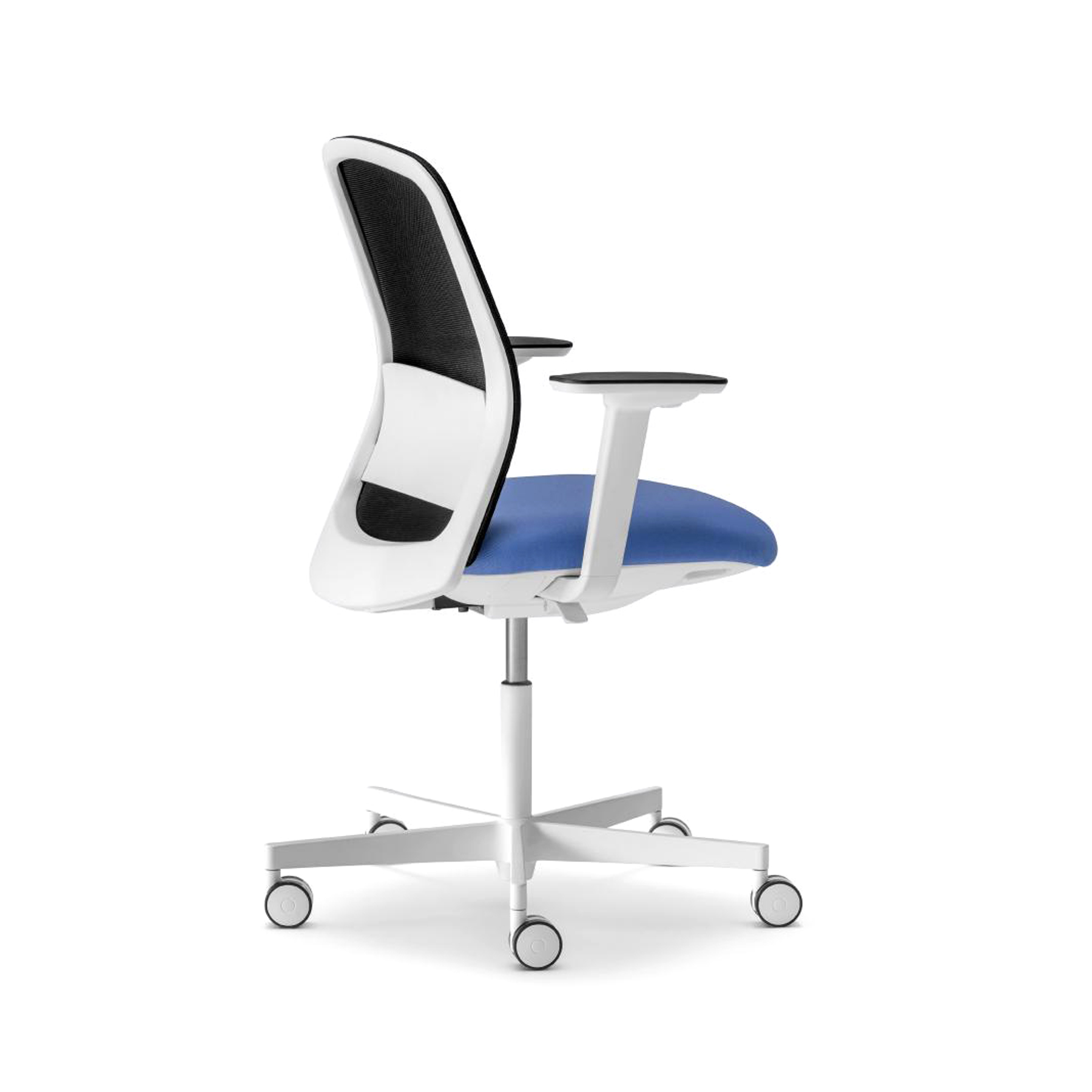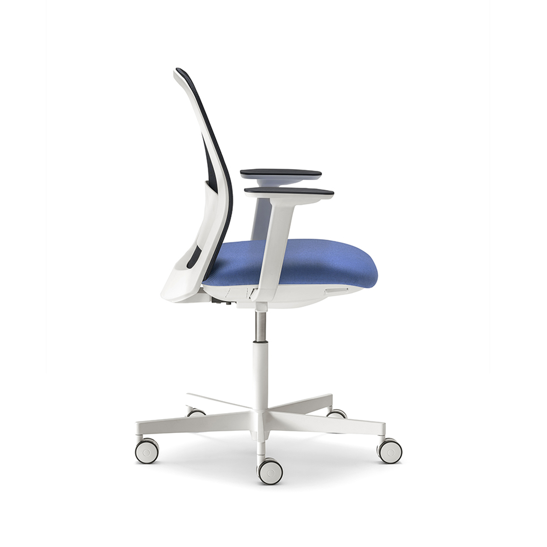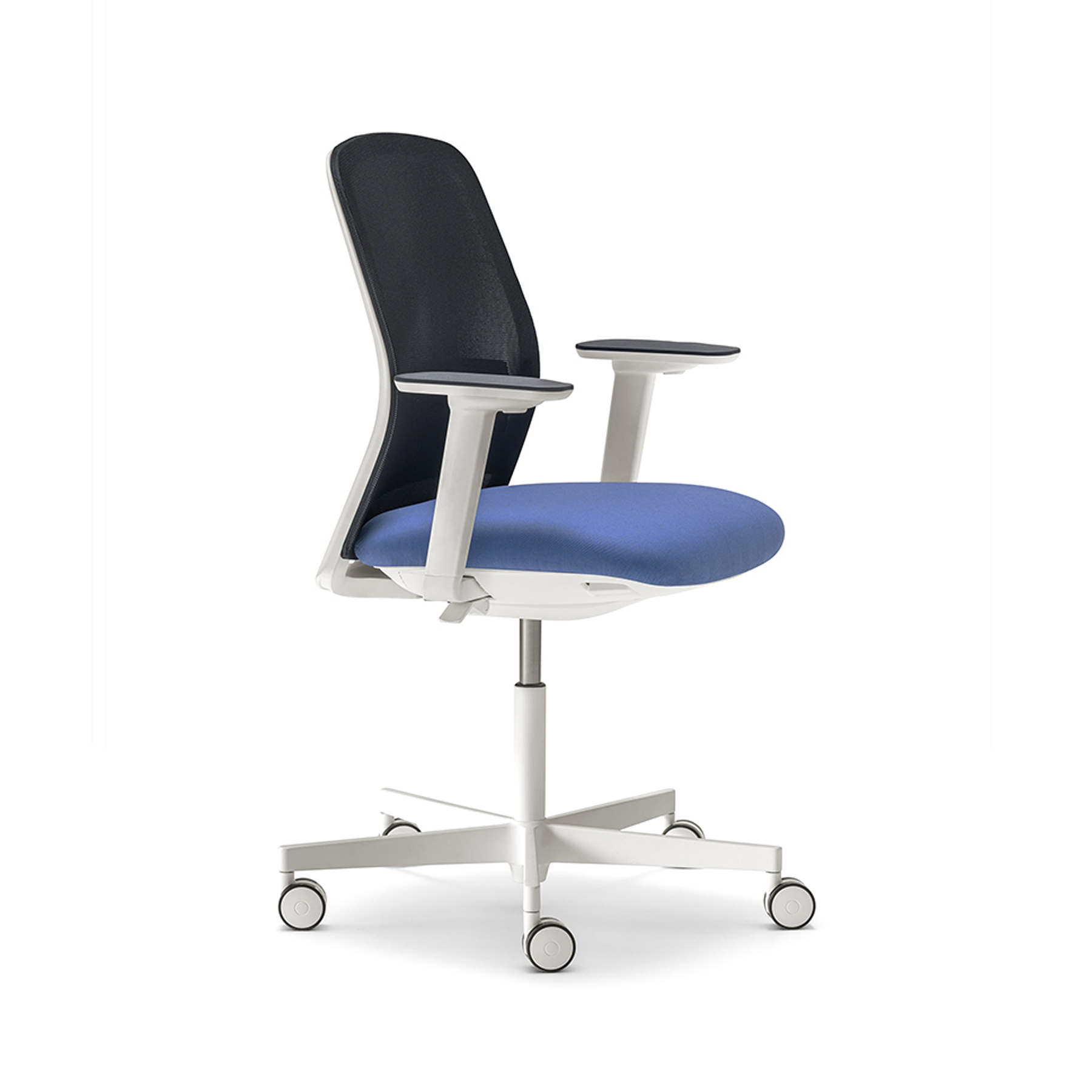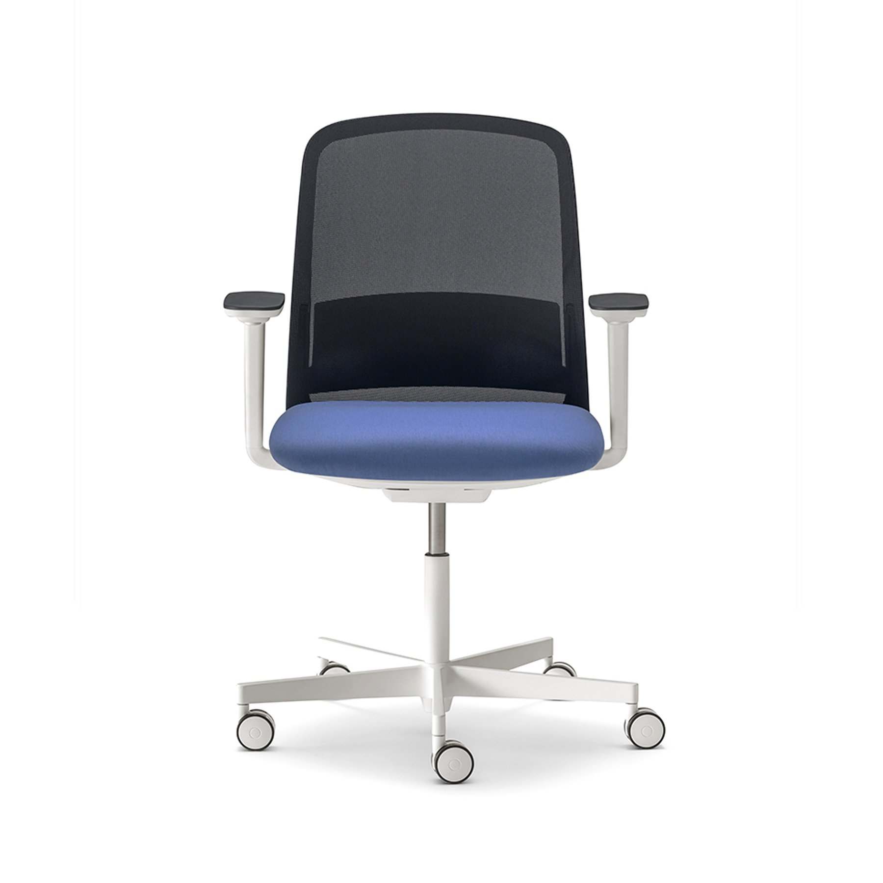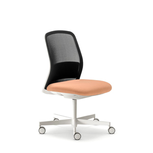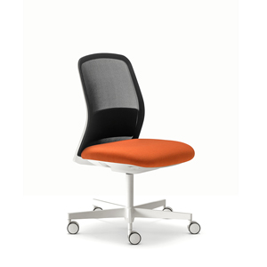 PRODUCT DETAILS: Upholstered seat with fully mesh back injected polypropylene lumbar support included height-adjustable swivel base in black or white powder coated finish.