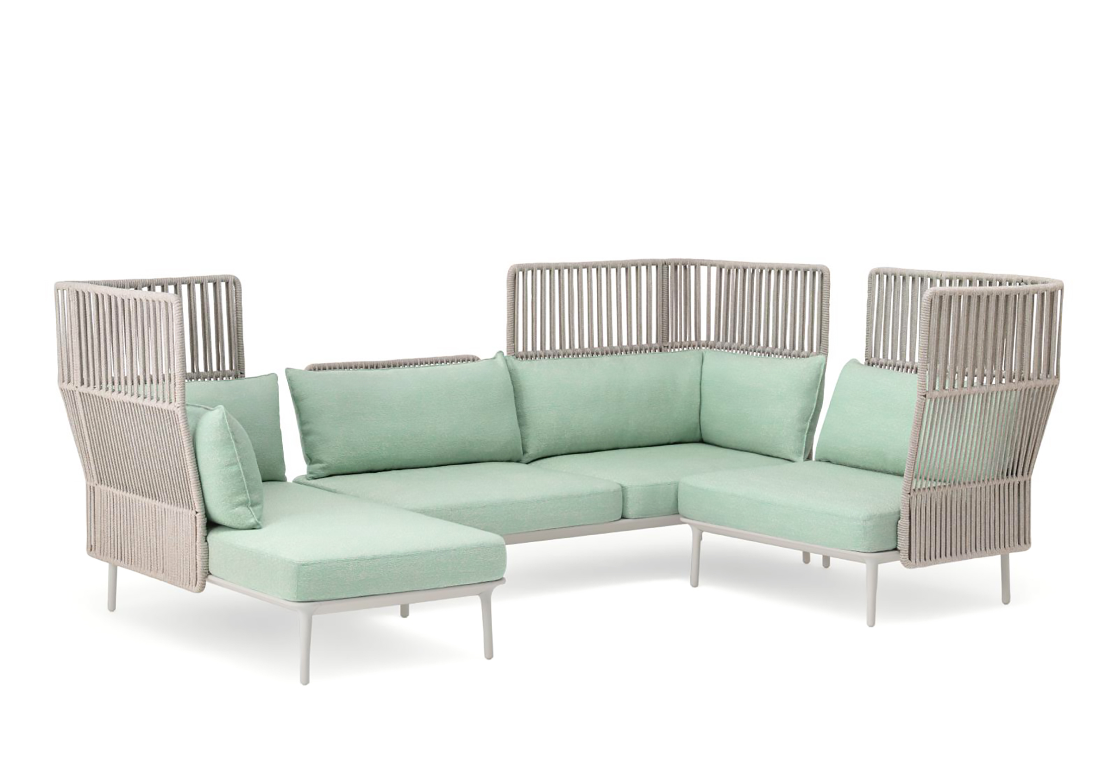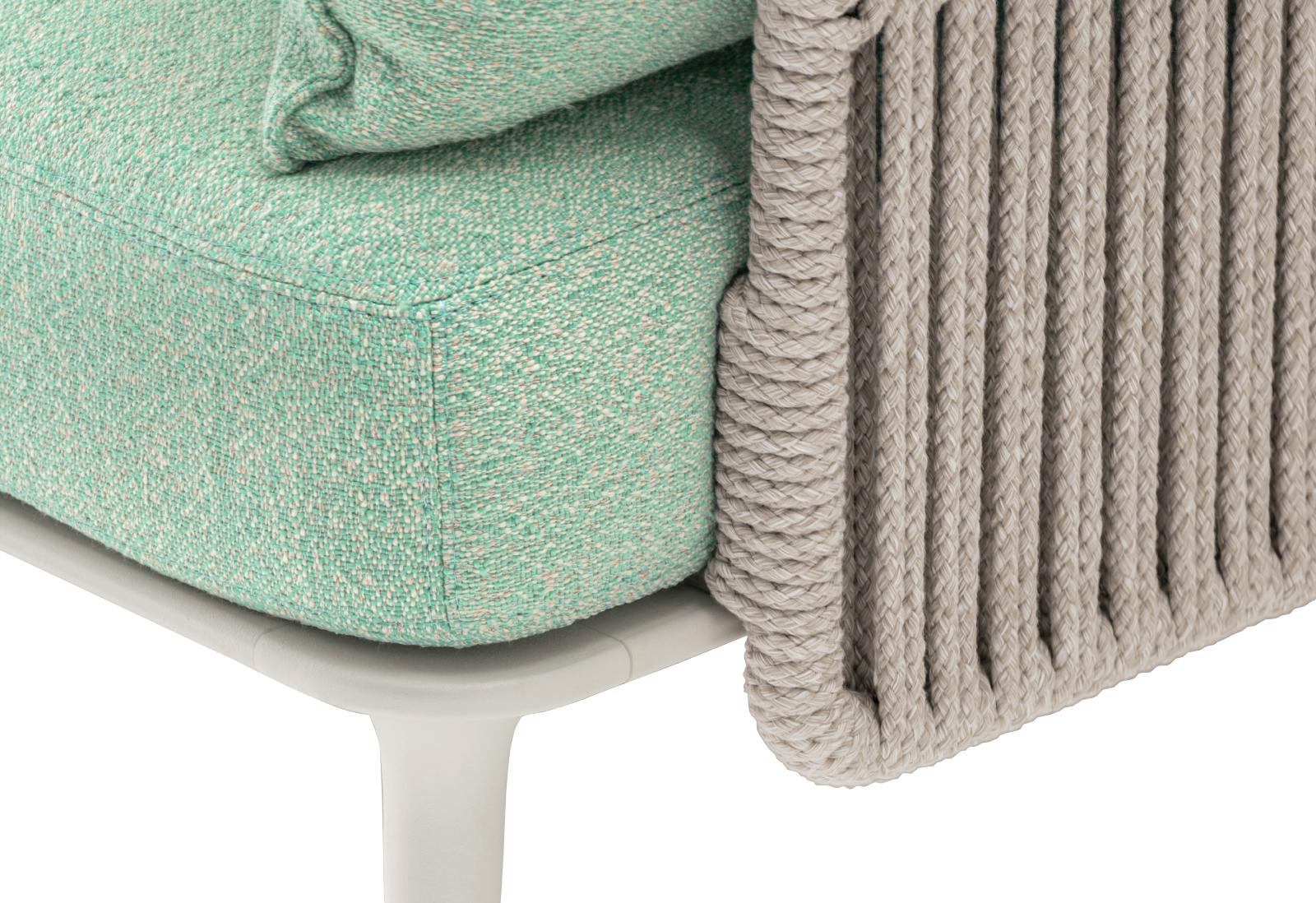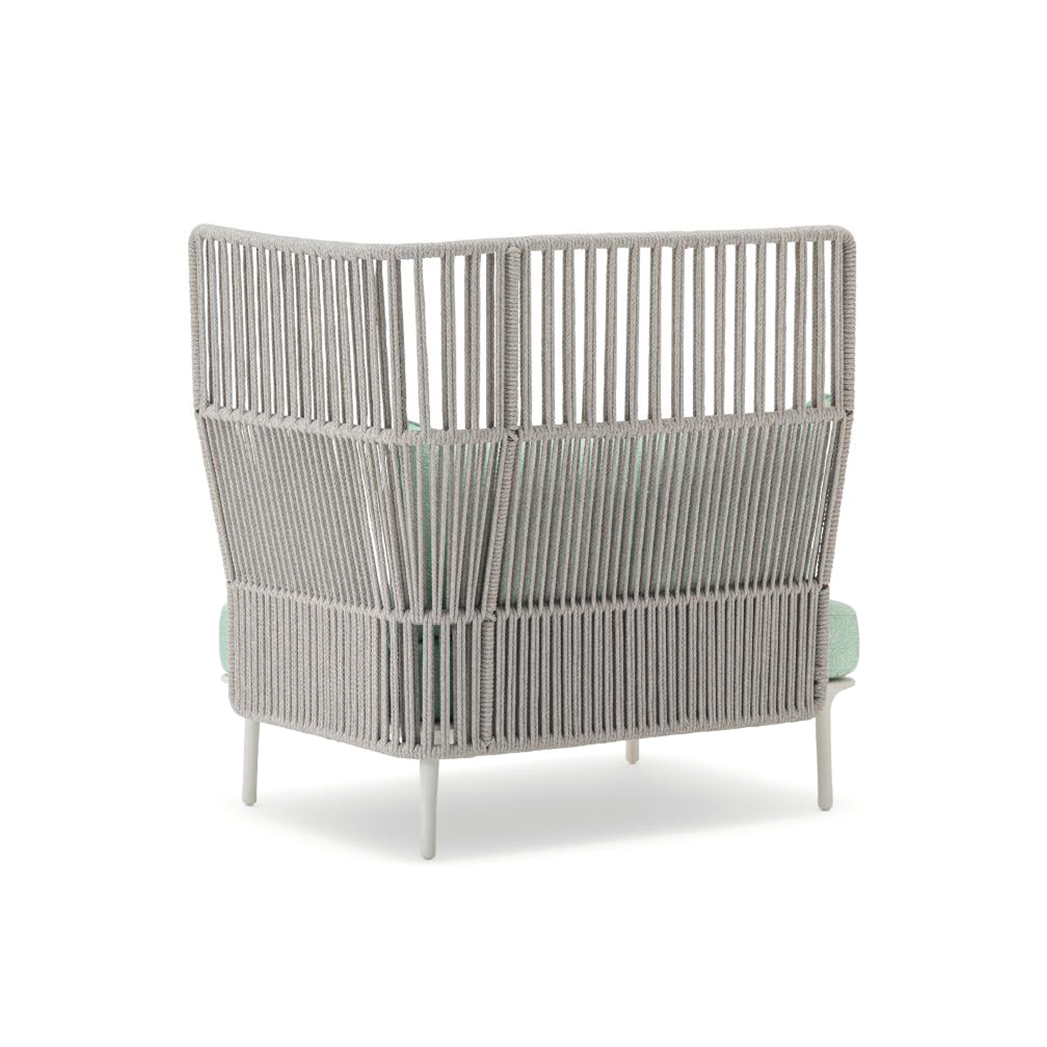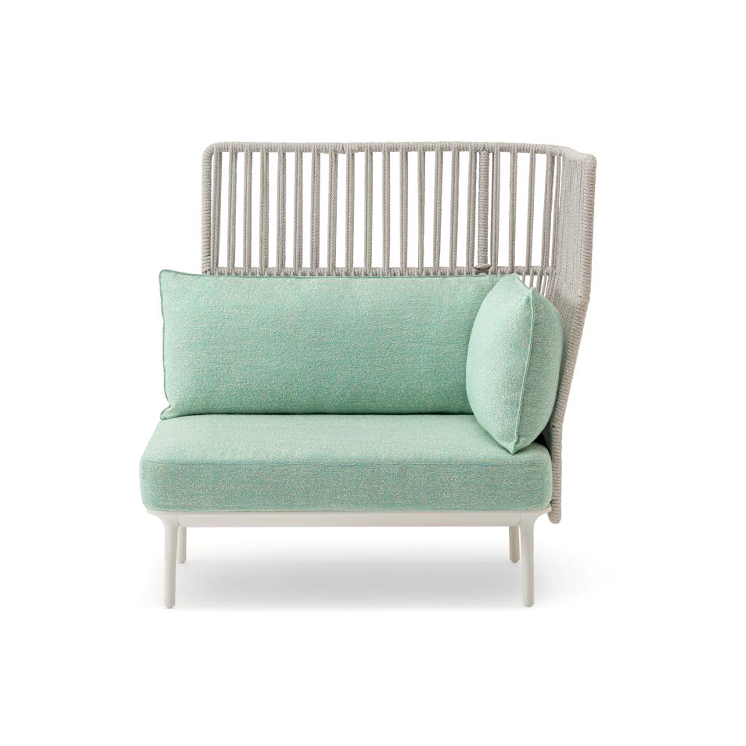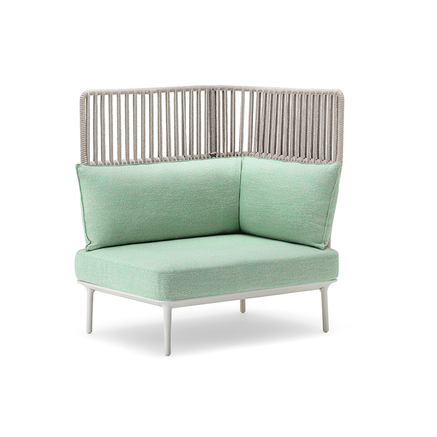 Left corner high backrest powder coated finish aluminium metal frame and water-proof outdoor fabric Grade D with 3 different color cord weaving rope finishes.