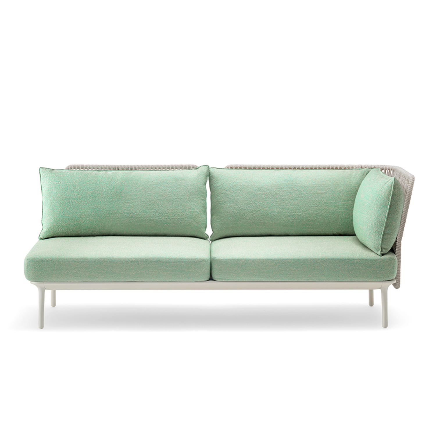 Left corner and linear sofa with low backrest (with corner cushion) Powder coated finish aluminium metal frame and water-proof outdoor fabric Grade D with 3 different color cord weaving rope finishes.